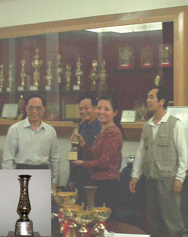 2003年3月3日下午,广州天河信鸽协会隆重举行2002年度颁奖会,广州罗家军鸽舍又一次登上领奖台.罗家军鸽舍在天河组织的"长城杯"500公里比赛中,以第一时间归巢打钟并报进(空距测量屈居第二),荣获亚军.图为罗斌先生夫人朱幼华(右二)在颁奖会上领取又一座奖杯.左一为天河区体育局局长范茂庆、左二为天河鸽协主席范迪光,右一为比赛赞助者长城兄弟鸽舍林刚强(香港)。(广广)
