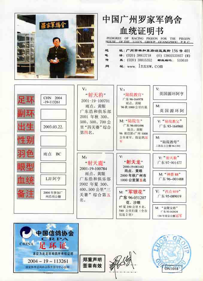 郑重声明:本鸽舍出让每一只鸽子,均出据"血统证明书"并附该鸽的"足环证",没有"血统证明书"的称为本舍源鸽,请不要轻信.本舍从2000年元月一日起已正式启用了上述"电脑打印"的"血统证明书"(见上图),之前本舍的"血统证明书"均是钢笔书写,但是,不论是电脑打印还是钢笔书写,均有罗斌先生签名盖章,请广大鸽友辩别真伪以免上当受骗.