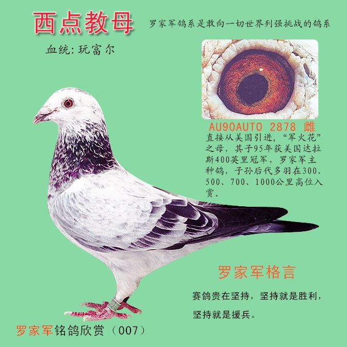 95年下半年,罗斌政委托在美国的朋友进口几只好鸽子,他负责派得力手下干将保证弄到批文。鸽子到手后,罗政委最讨厌的是两只“花不拉嚓”的麒麟花,故放忘了用。后接到美国小余电话说,花母鸽的儿子刚拿了当地400英里大赛的冠军,叮嘱赶快用。于是,罗斌先生这才想起,在96年春季配上一只成绩鸽,即做出大名鸽“军火花”,后来配了多羽公鸽,皆有上乘表现。特别是配其子做出的“西点019”花公,后来也做出“军银花”等多羽优秀选手鸽。