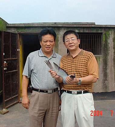 重庆永川市赛鸽高手曾德友,曾展转引进过"罗家军"的鸽子(四川资中邵成祥处),头一年(2004年春)参加重庆公棚赛就有了发挥,给他带来了惊喜和荣誉.这次罗斌先生来到永川,他全程陪同,并购买到"罗家军"的两只原环鸽:一只为LJJ阿亨提纯的雨点公,一只为"2001年500公里冠军"神箭753"的平辈鸽,军火花的女儿.曾先生认为,现在要快出成绩、出好成绩,直接引进国外的原环鸽已经过时与落后了.这样不仅是成本高、风险大,而且什么时候能出成绩,出什么成绩心里没底,好象遥遥无期.特别是随着赛鸽运动向更高水平发展,一次比赛定乾坤的鸽种就远不如多关赛与多次复放的鸽种受欢迎.只有是经过这十多年,中国一些名家率先从各种渠道引进世界名血名鸽后,通过他们的创作并投入实战检验与筛选后的,有"韧性"的鸽子才是首选.这也就是他引进"罗家军"鸽系的思路.......图为罗斌先生在曾德友先生家欣赏他的爱鸽时合影.