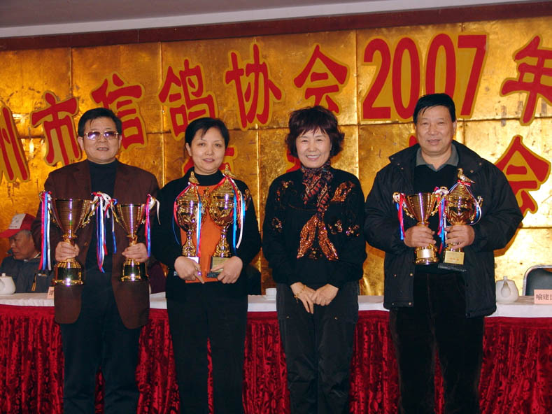 2008年2月1日下午,广州鸽协在革新路红帆酒店召开2007年年会暨颁奖大会,广州市体育局副局长张桦,代表体育局到会讲话并颁奖。图为张局长为获得广东省第一届体育大会信鸽项目湖北广水联赛总冠军、亚军、广州罗家军鸽舍罗斌夫妇颁发奖杯。左一:罗斌、左二:朱幼华、右二:张桦副局长、右一:第三名卢裕民