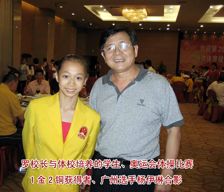 罗政委从海心沙部队转业后,1997年-2002年在广州体校工作,98年,杨伊琳只有5、6岁,就被学校体操教练看中招到学校。小伊琳长的漂亮,嘴巴又甜,见到罗政委就叫“校长好”,罗政委印象特别深刻。2003年进到省队,很快就被国家队相中,作为重点选手培养。图为罗政委与小伊琳在欢迎奥运冠军晚会上合影。