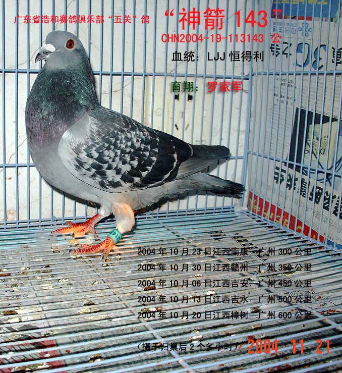 广东省浩和俱乐部"五关赛"残47羽,综合19位。血统:银河X恒得利,其父“波音747”,岭南巴塞隆那1000公里5名,其母近亲留种鸽。