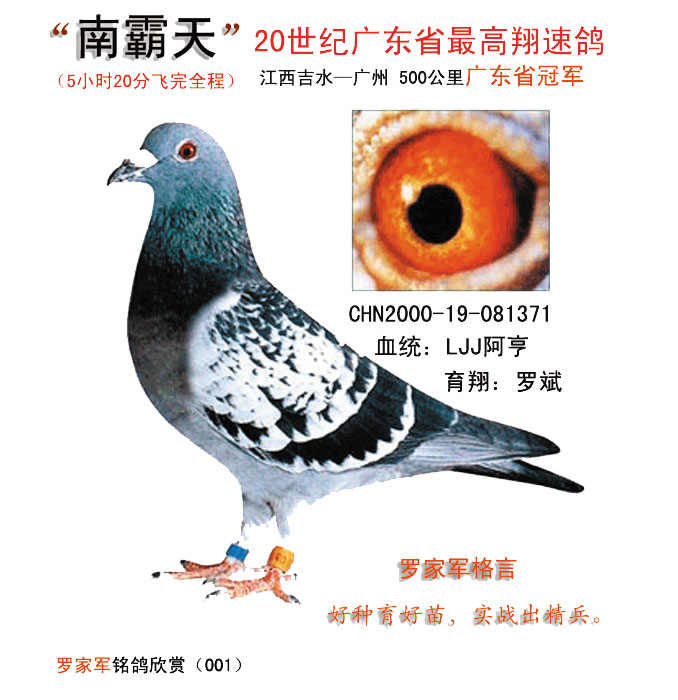 在上一个世纪里,广州罗家军鸽舍以他创造性的选种、育种、管理、训练等一系列崭新的赛鸽理念,在广州鸽坛独领风骚十多年至今不衰,其铭鸽辈出。从今天开始,本站将有计划地向广大鸽网友介绍“罗家军”铭鸽彩照,供大家欣赏,也希望展开研讨。(广广)