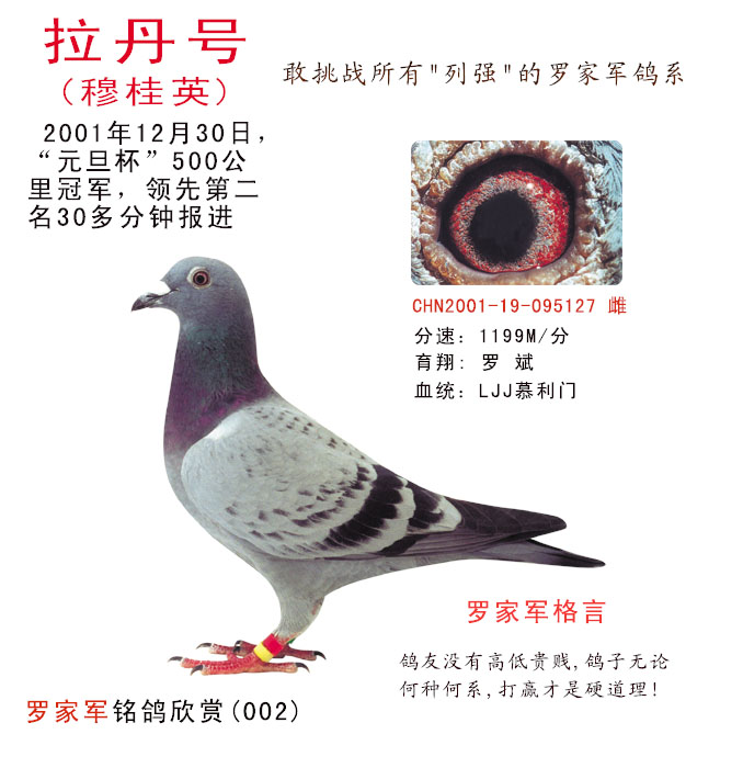 广州罗家军鸽舍的大名鸽“拉丹号”(又名:穆桂英)很多人都问罗斌先生:“当初为什么取这个名字?”有的甚至在网上指责......罗斌先生解释很简单,当时正值“9.11”不久,“拉丹”的大名满天飞,给自己的冠军鸽取这个名字,绝没有推崇“恐怖主义”的意思,而是“拉丹”那种不畏强暴的民族主义精神,是每个国家、每个人不可缺少的......鸽界尤其需要拉丹这种气魄......所以,罗斌先生认为,罗家军鸽系是敢于向世界所有“列强”挑战的鸽系。特别是有的鸽友引进“罗家军”在国际鸽联组织的世界大赛中(公棚)摘取桂冠的消息传来后,更加坚定了他“以夷治夷”,打造“中国品牌”,为国争光的信念。(广广)