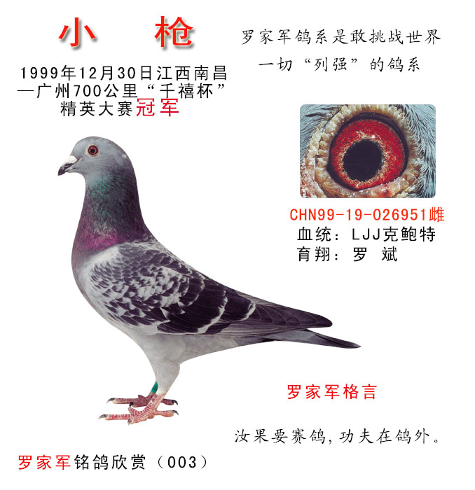 罗家军铭鸽“小枪”在1999年12月30日那个寒风凛冽的日子里,以第一时间归巢报进获得“千禧杯”大奖后,《中华信鸽》、《翱翔》等重大刊物陆续登载了她的英姿,同时写了一段广告词:“老枪生小枪,枪枪中十环”、“大将生少将,代代夺桂冠”。后来,很多鸽友多方打听“罗家军”育种、保种的秘诀,罗斌先生的回答只是两个字:自然......。的确,罗家军“重出江湖”后,一代一代铭鸽辈出,种还是那些种,鸽也是那些鸽,十几年常胜不衰......(洪仔)
