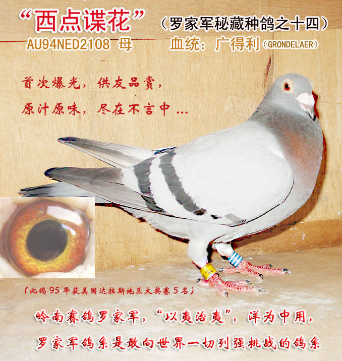 美国的赛鸽运动素以竞争激烈闻名与世,罗家军从1993年开始,通过各种渠道在美国赛鸽水平比较高的德州达拉斯陆续引进十多羽美国的铭血优胜鸽系,终于在1996年罗家军迎来了第一次全面开花、无比辉煌的鼎盛时期。"军火花"就是在这个时候诞生并闻名与世的。这只广得利黄眼灰母,就是引进的玩富尔、戈登、詹森、慕利门等几路鸽系中的一路,本身在美国得过300英里大奖赛5名,它也在广州直接做出选手参加300公里比赛的曾获第三名...(广广)