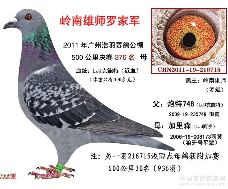 “岭南雄师罗家军”2011秋在广州浩羽赛鸽公棚入赏的一只近亲母鸽。(广广)