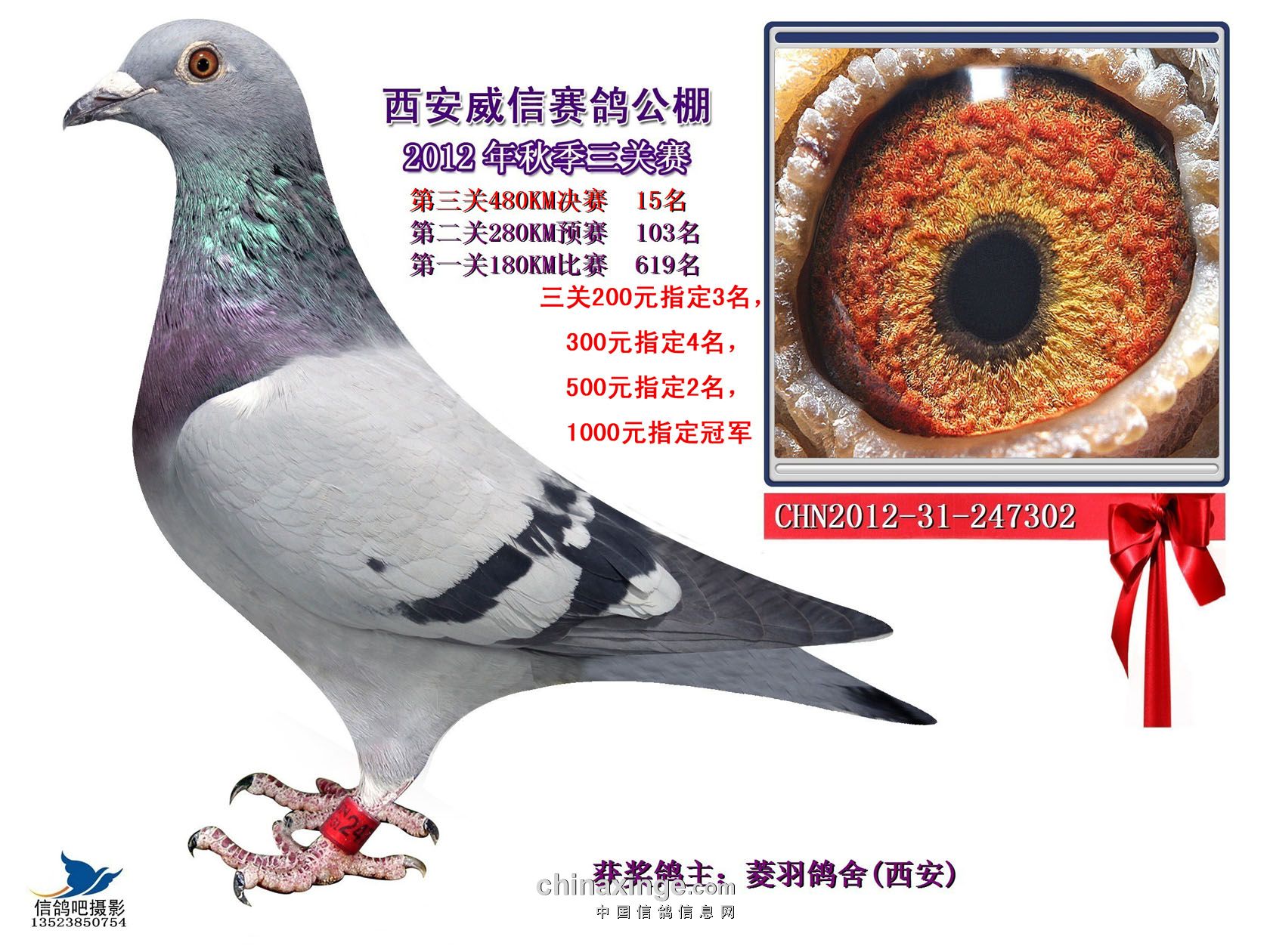 这羽佩带重庆足环的2012-31-247302灰鸽,是重庆开县鸽友程永年引进罗家军血系后出的小鸽给朋友送到西安参赛的。另一羽同父母的12-31-247331灰白条获得49名,还有一只同孵2012-31-247301灰白条(见本站另图)获西安威奇国际公棚决赛234名。程永年今年用一对鸽子出四只送西安两个公棚参赛,结果三只入赏。特别是威信公棚预赛决赛于12月份举行,天寒地冻,气候比较恶劣,有效期仅回199羽。威奇公棚预决赛是11月上中旬举行,与15名同孵的2012-31-247301灰白羽入赏234名。由此可以看出,罗家军血系耐恶劣天候的特质有极强的遗传(广广)