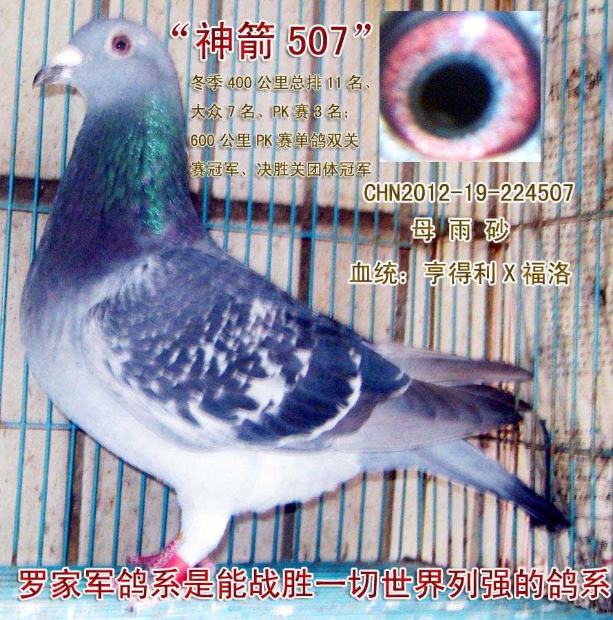 2012年12月24日,广州市冬季600公里比赛在江西樟树开笼,温差很大,天气恶劣,罗家军一羽2012-19-224507PK507雨点砂眼母鸽,最后获广州特比环等额PK赛冠军。这羽“神箭507”砂眼母鸽,在冬季400公里比赛中745羽参赛,有效期归巢仅40羽,同时获得等额特比环PK赛3名、总排名11名,大众赛(指定)7名。
