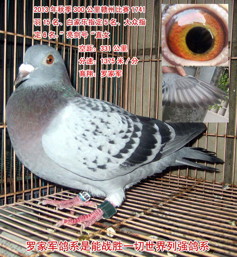 2013年10月3日7:00,广州鸽协300公里比赛1741羽选手于江西赣州放出。此鸽为罗家军大铭鸽“亮剑号”直女,于上午11:01分归巢扫描上传成功,获得总排15名,百家乐指定5名、大众指定6名、团体7名。